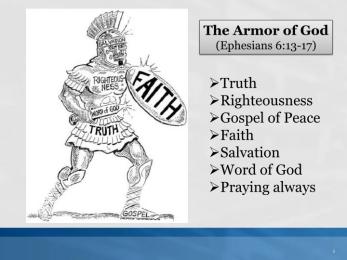Be strong in the Lord and in the strength of his power. Put on the whole armor of God, so that you may be able to stand against the wiles of the devil. For our struggle is not against enemies of blood and flesh, but against the rulers, against the authorities, against the cosmic powers of this present darkness, against the spiritual forces of evil in the heavenly places. Therefore take up the whole armor of God, so that you may be able to withstand on that evil day, and having done everything, to stand firm. Stand therefore, and fasten the belt of truth around your waist, and put on the breastplate of righteousness. As shoes for your feet put on whatever will make you ready to proclaim the gospel of peace. With all of these, take the shield of faith, with which you will be able to quench all the flaming arrows of the evil one. Take the helmet of salvation, and the sword of the Spirit, which is the word of God.