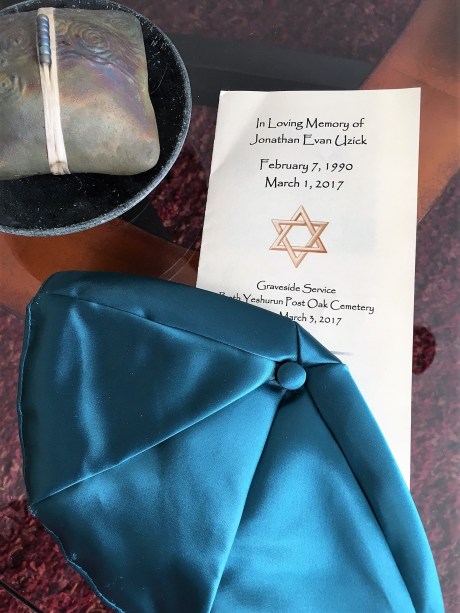 Since the family is Jewish, I knew the funeral would be quick, so within an hour I had a plane ticket and began rearranging my schedule for the weekend. I landed in Houston by mid-morning on Friday, and arrived at the graveside by 2pm. Standing in the bright sunlight, feeling the cool spring breeze, I held tightly to the yarmulke I received fourteen years earlier at Jonathan, and his twin sister, Robin’s, b’nai mitzvah.